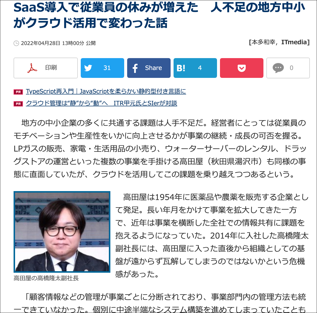 さて、この度「ITmedia NEWS」にて弊社のクラウド活用による経営判断の迅速化や作業効率化の実現についてを取材していただきました。