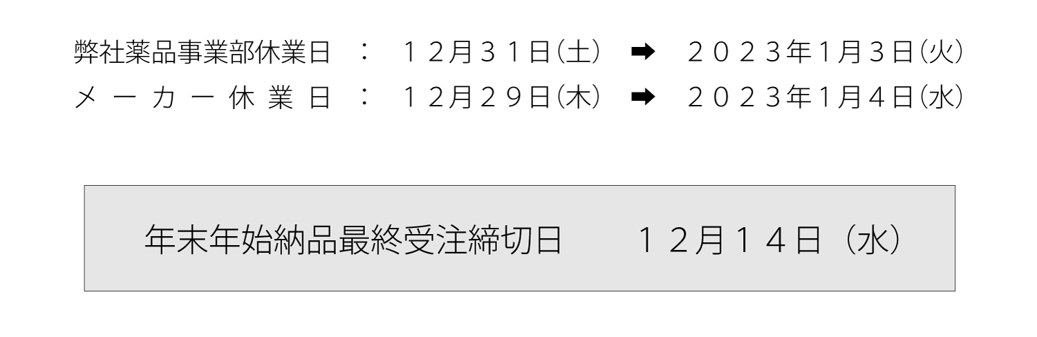 さて、誠に勝手ながら標題の件につきまして、下記の通りにご連絡いたします。なお、年末年始はかなりの混雑が予想され、通常よりも早めの手配が必要な為、在庫状況ご確認の上早々の発注を賜りますようお願い申し上げます。